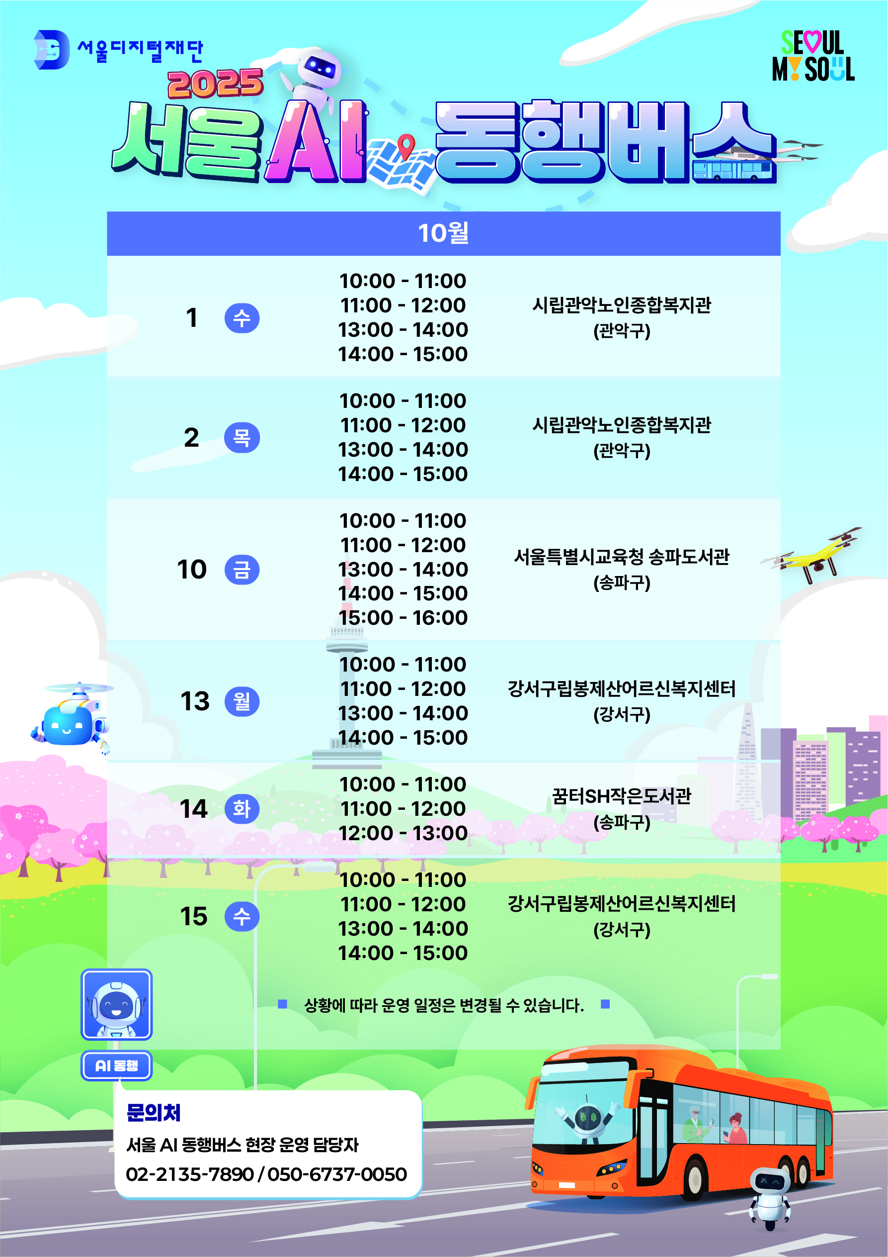 서울AI동행버스 운영 일정 안내입니다. [10월 01일(수) ~ 10월 15일(수)] 관련 문의사항은 02-2135-7890 / 050-6737-0050 으로 연락 부탁드립니다.