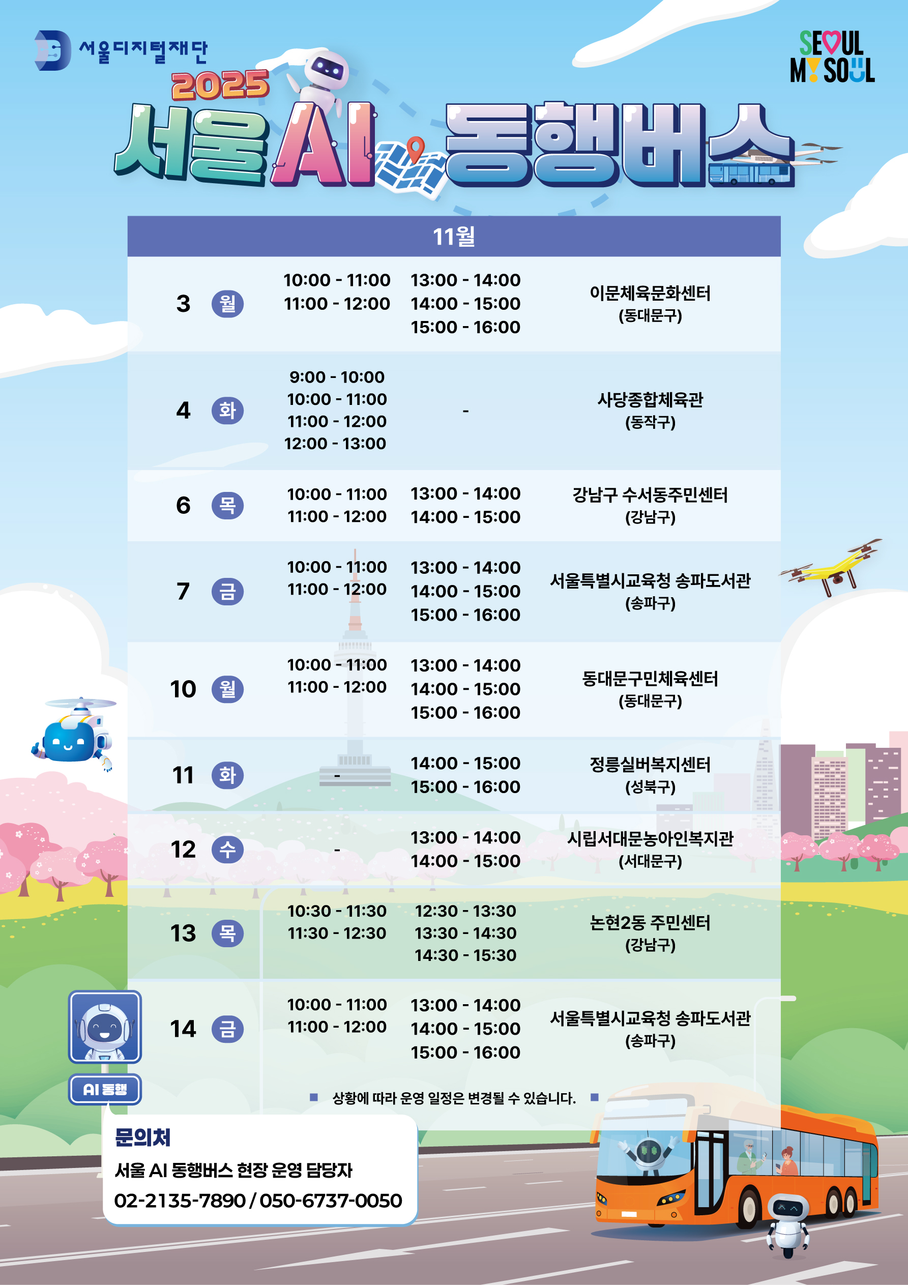 서울AI동행버스 운영 일정 안내입니다.[11월 03일(월) ~ 11월 14일(금)] 관련 문의사항은 02-2135-7890 / 050-6737-0050 으로 연락 부탁드립니다.